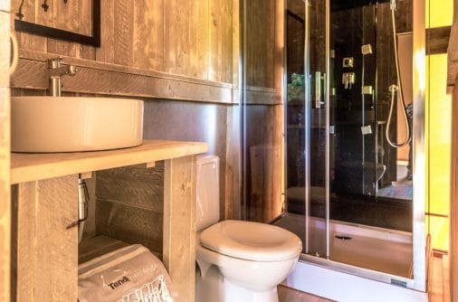 Naast de stoere safaritent, waarbij men gebruikt maak van de faciliteiten van de locatie, hebben wij ook luxe safaritenten met eigen badkamer. Het sanitair in de safaritent bestaat uit een ruime douche, een toilet en wastafel met opbergmeubel. De safaritenten met eigen badkamer staan o.a. op: Lac de Bonnefon, La Maison Bornat en Agriturismo Le Sorgive e Le Volpi.